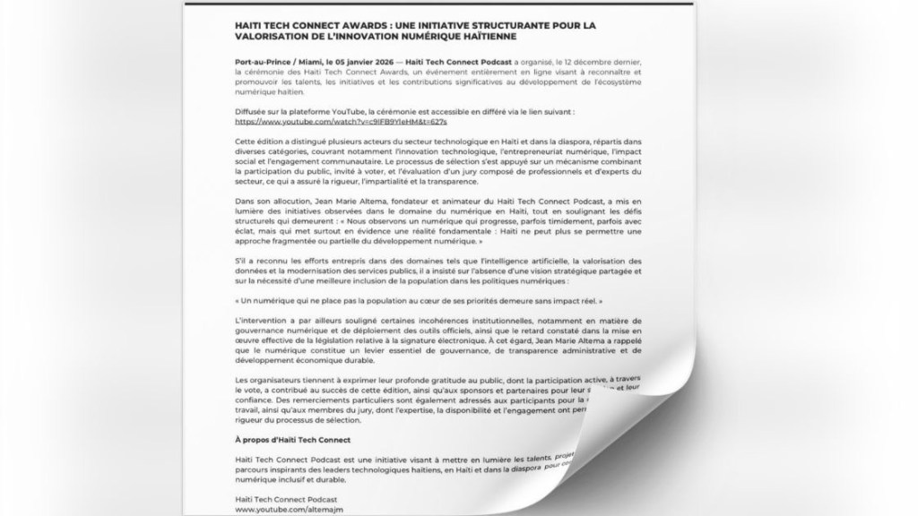 Les Haiti Tech Connect Awards se sont tenus le 12 décembre 2025 sous forme de cérémonie virtuelle, avec pour objectif de mettre en valeur les talents et initiatives qui contribuent au développement du numérique en Haïti et au sein de la diaspora.