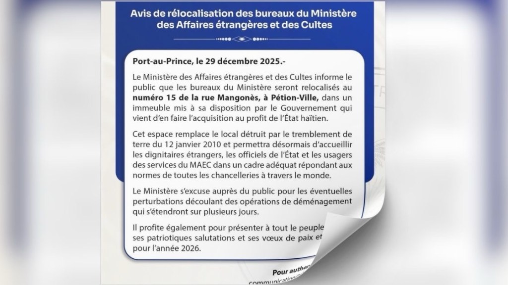 Le Ministère des Affaires étrangères et des Cultes annonce la relocalisation de ses bureaux à Pétion-Ville, selon un avis officiel publié le 29 décembre 2025.