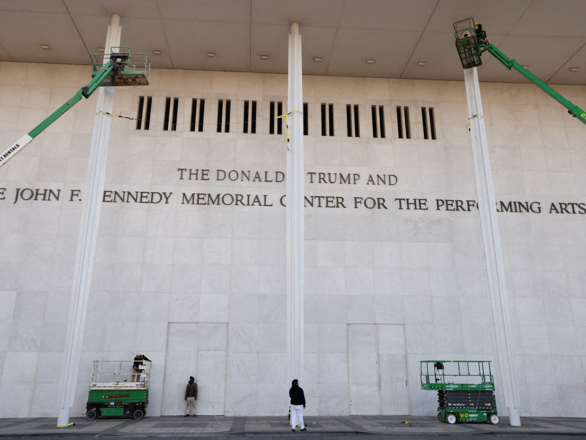 Workmen added metal lettering to the building’s exterior on Friday that declared, “The Donald J Trump and the John F Kennedy Memorial Center for the Performing Arts.”